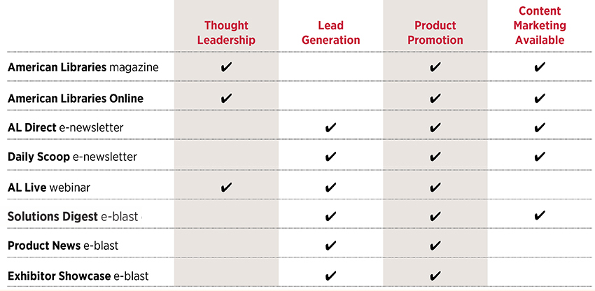 - Sponsored Posts—information about your product, featured on AL Direct or on American Libraries’ website